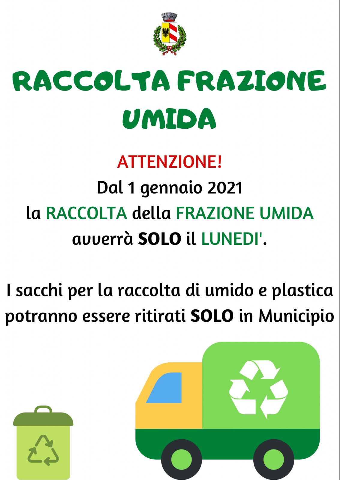 DA LUNEDI' 01.01.2021 LA RACCOLTA DELL'ORGANICO AVVERRA' SETTIMANALMENTE NELLA GIORNATA DI LUNEDI