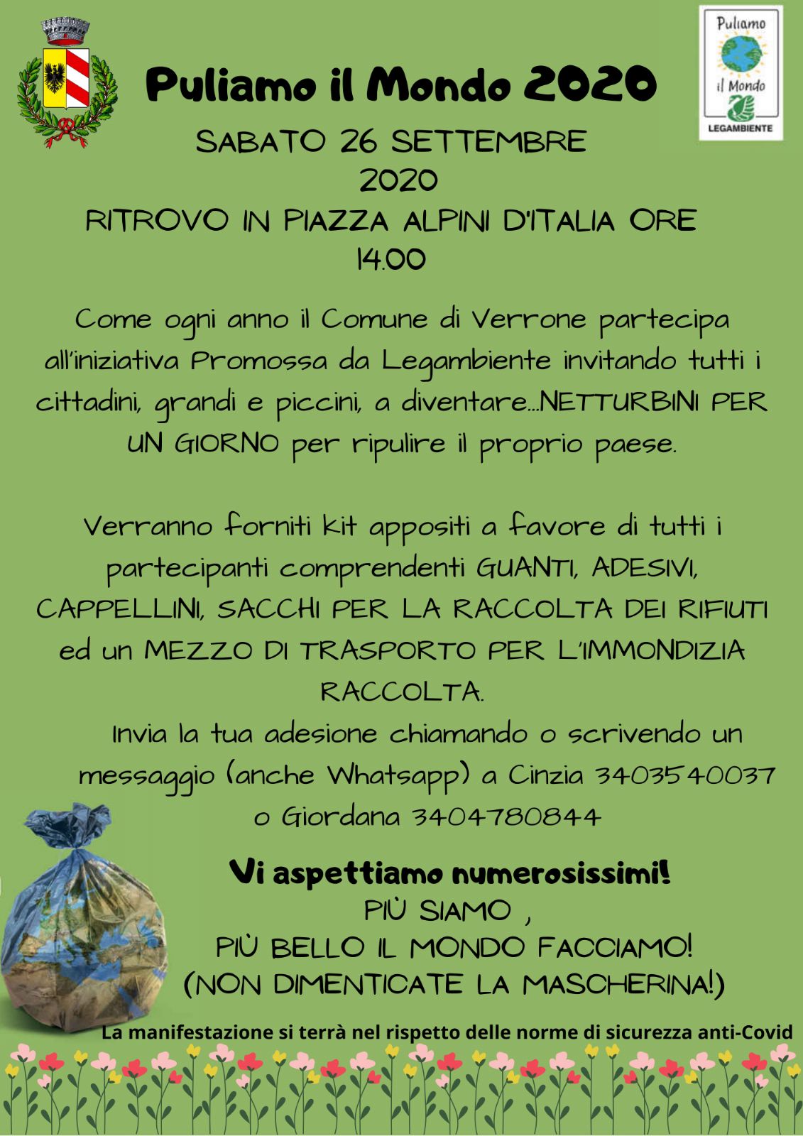 PULIAMO IL MONDO 2020 SABATO 26 SETTEMBRE 2020 RITROVO IN PIAZZA ALPINI D'ITALIA ORE 14:00