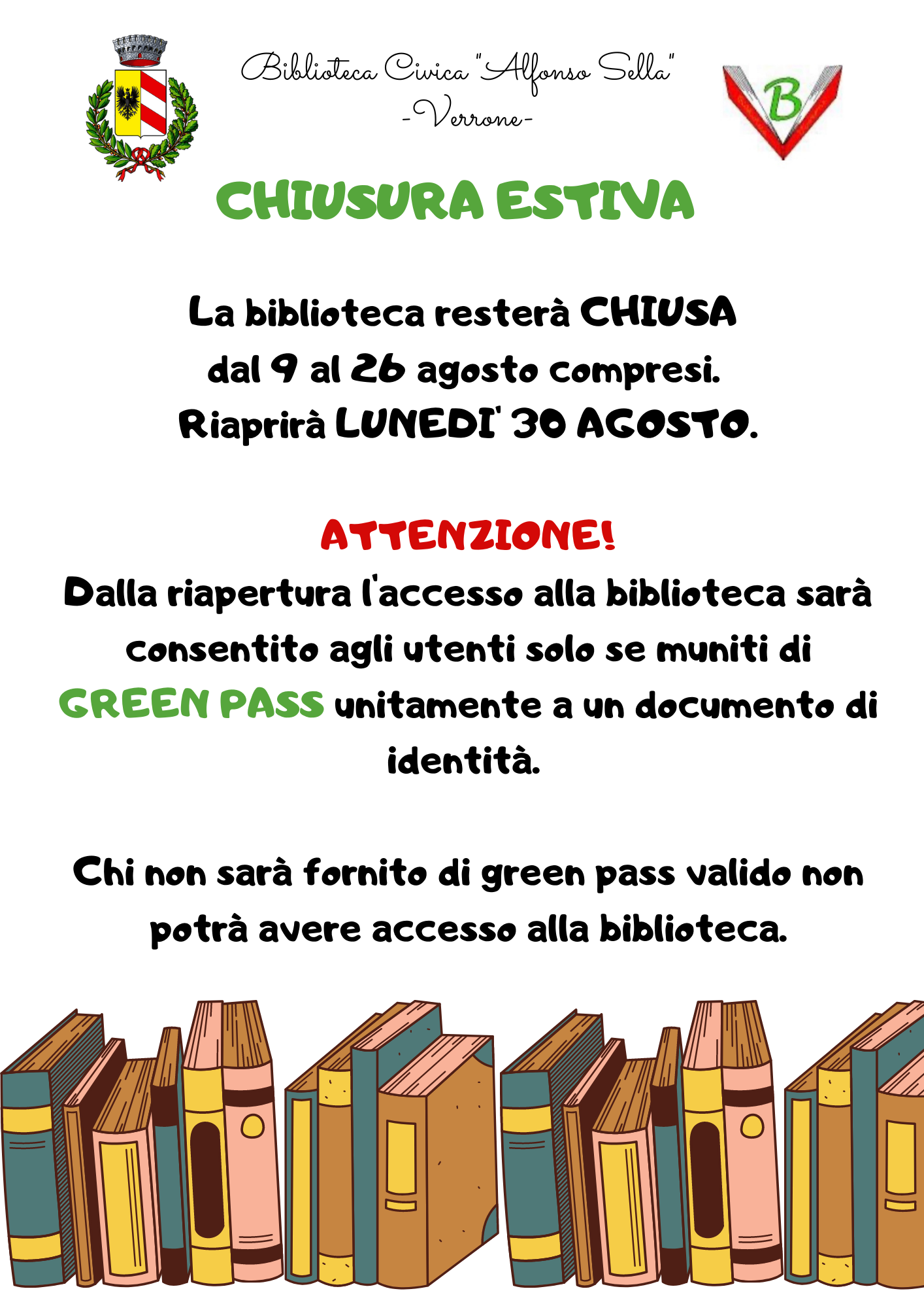 CHIUSURA BIBLIOTECA E GREEN PASS
