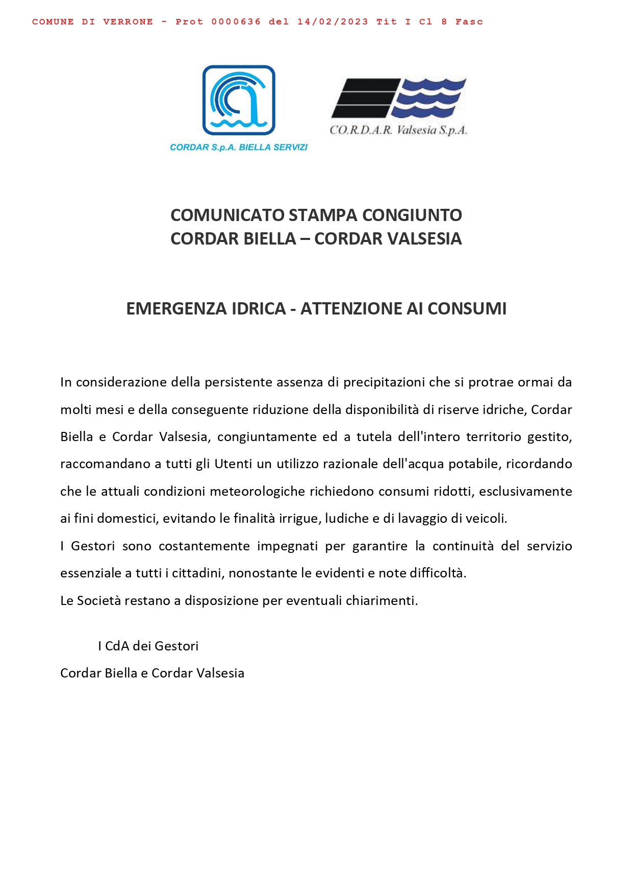 - EMERGENZA IDRICA _COMUNICATO STAMPA CONGIUNTO CORDAR BIELLA-CORDAR VALSESIA[.pdf 514,53 Kb - 15/02/2023]