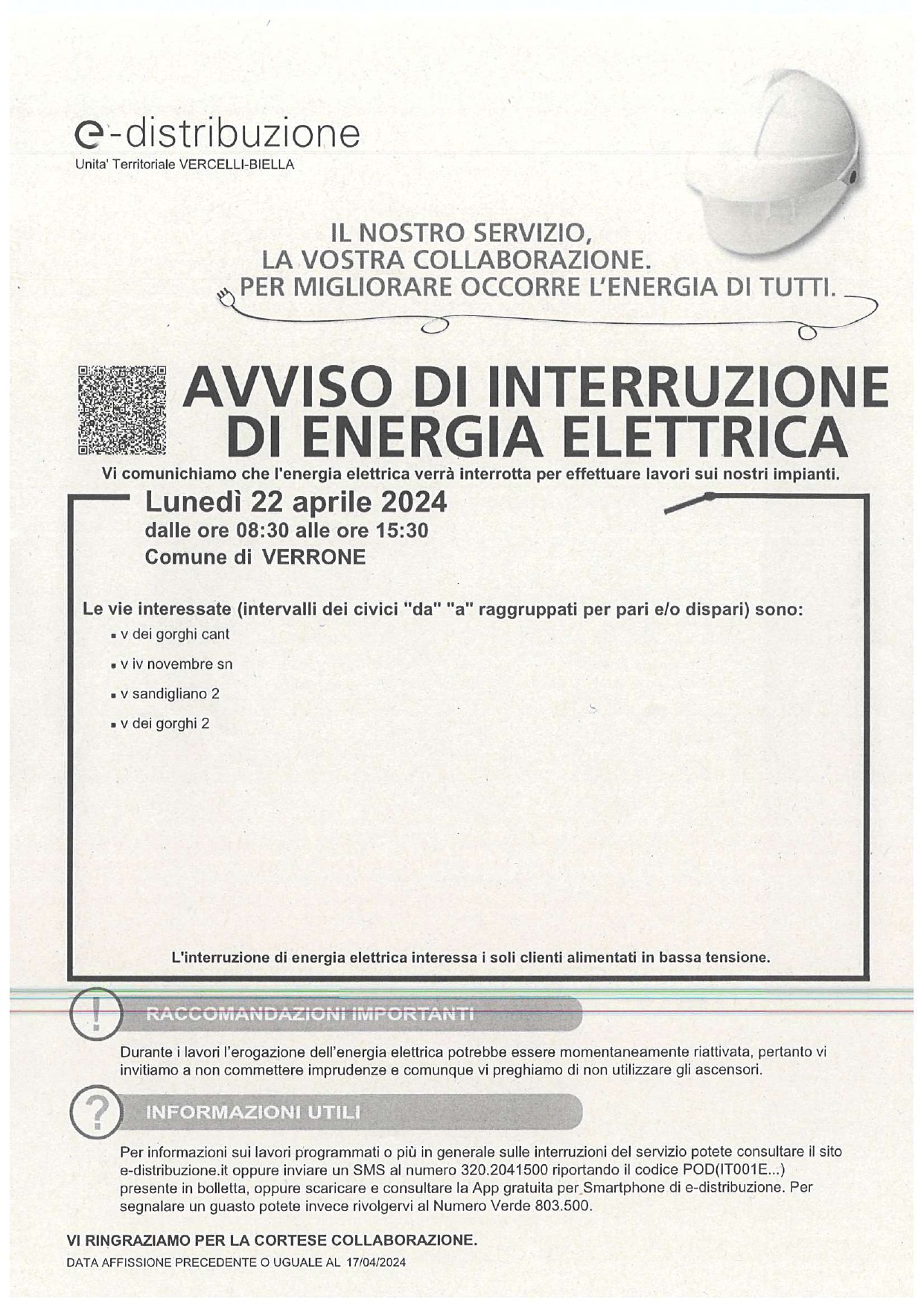 Di seguito l'Avviso pervenuto da E-Distruzione per l'interruzione del servizio di energia elettrica in programma per Lunedì 22.04.2024 dalle ore 08:30 alle ore 15:30