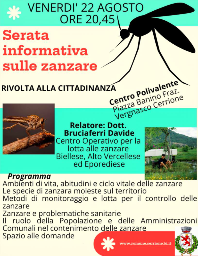 Venerdì 22 Agosto ore 20:45 presso il Centro Polivalente in Piazza Banino - Fraz. Vergnasco - Cerrione si terrà una serata informativa sulle zanzare
